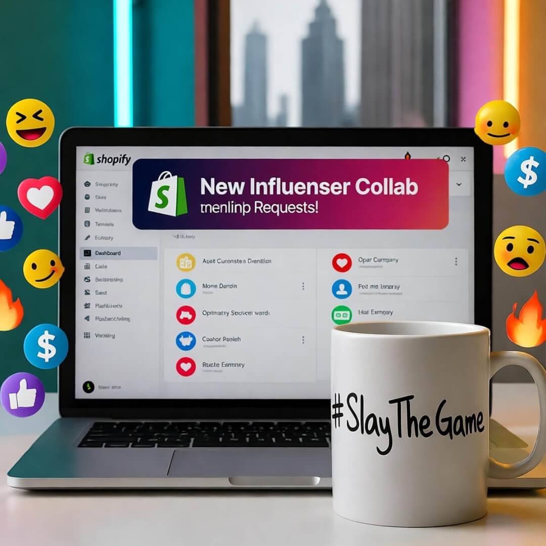 Glowing laptop with Shopify dashboard, "#SlayTheGame" mug, neon city skyline, emoji reactions.